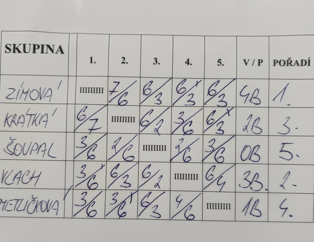 Kat. Velký kurt: 1. Zimová Viki, 2. Vlach Martin, 3. Krátká Adriana. 4. Metličková Emma, 5. Šoupal Radim