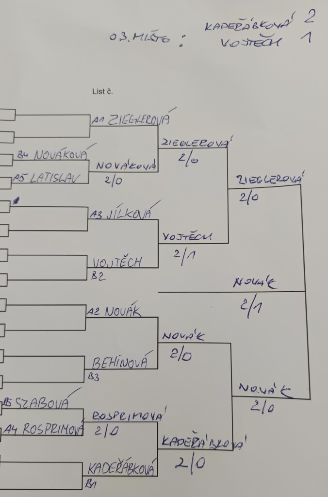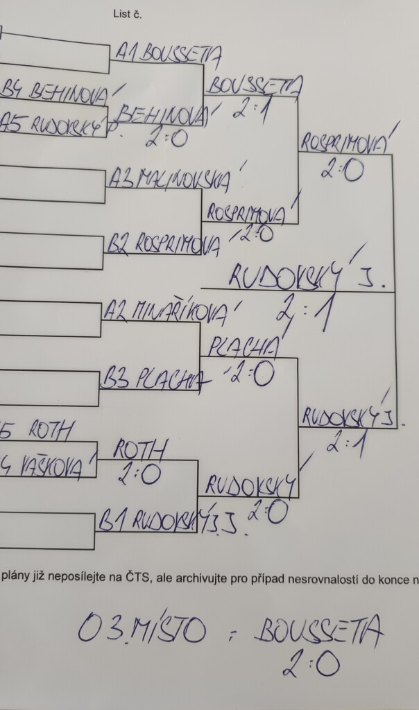 Zde nakonec v začínajících zvítězila Viktorie Petříková, která ve finálovém zápase zdolala Jirku Rudovského 10:6. Třetí místo si pak vybojovala Klaudie Plachá.